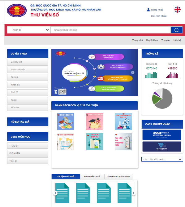 Thư viện số Trường Đại học Khoa học Xã hội và Nhân văn – Đại học Quốc gia TP. Hồ Chí Minh với gần 100.000 tài liệu số với các bộ sưu tập Sách, Luận văn, luận án, khóa luận tốt nghiệp, Công trình NCKH, tạp chí và các loại tài liệu khác... sẽ cung cấp nhiều thông tin hữu ích trong việc học tập và nghiên cứu khoa học cho bạn đọc. Bạn đọc liên hệ Trung tâm Học liệu & E-Learning – Trường Đại học Sư phạm – Đại học Đà Nẵng để được cung cấp mật khẩu.
